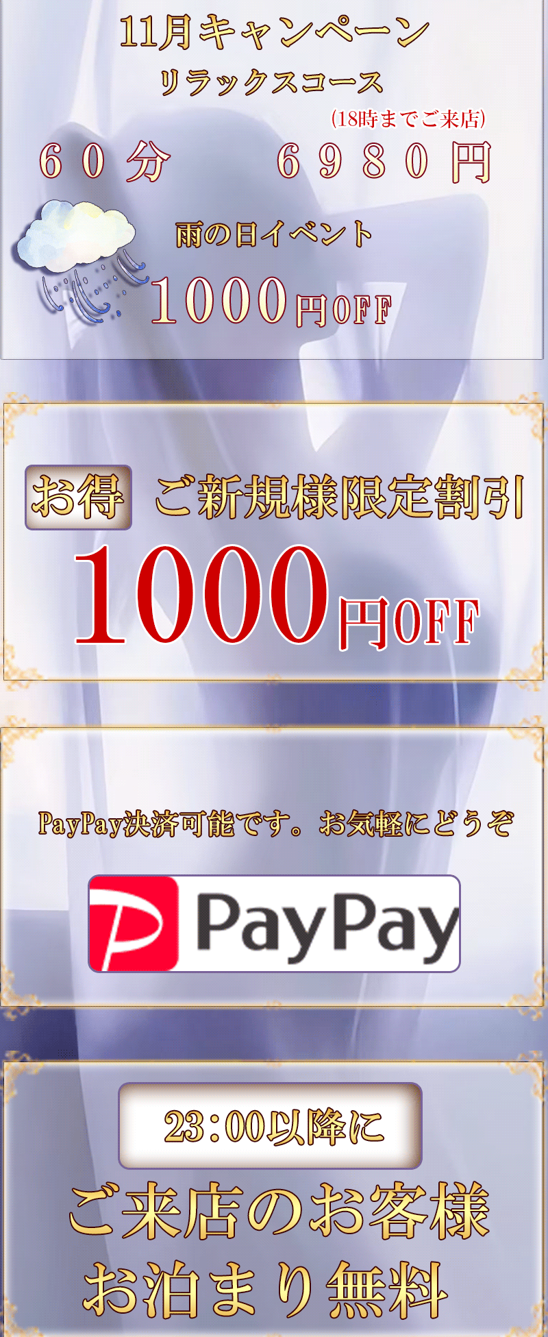 私たちはそんな日々お疲れの貴方様に尽くし、疲れを取り除くべく日々腕に磨きをかけております!!当店自慢のマッサージ技術で是非、気持ち良くなっていただければ幸いでございますそれが私たちの喜びです!